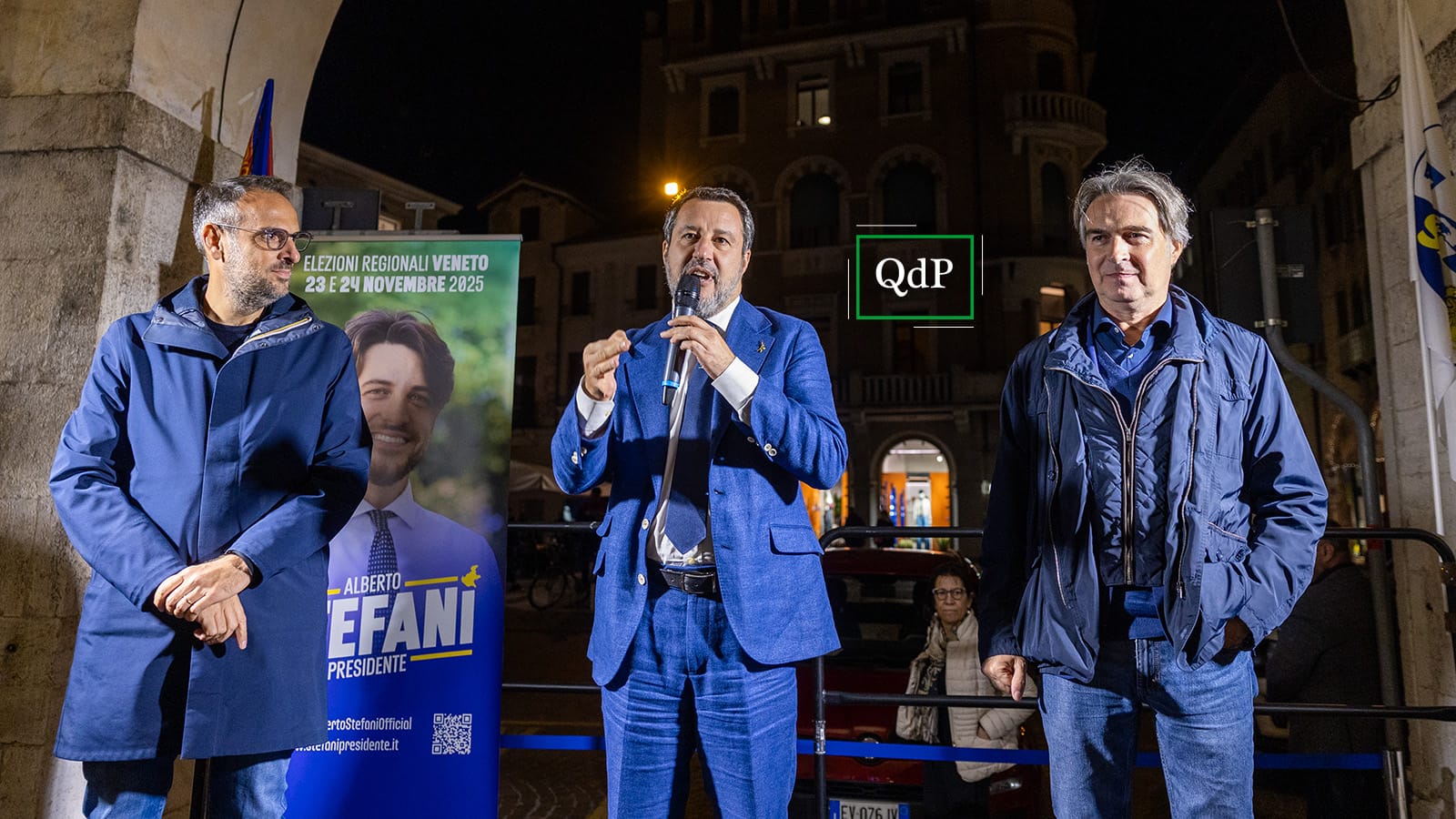 L’occasione è stata una tappa del tour elettorale del segretario leghista in Veneto a sostegno del candidato del centrodestra Alberto Stefani: in piazza dei Signori, oltre al segretario provinciale Dimitri Coin, il sindaco Mario Conte e l’assessore Federico Caner, sostenitori e candidati hanno accolto Salvini. Assente Zaia, impegnato all’ultima (sua) edizione di Fiera Cavalli come presidente della Regione, dopo aver comunque condiviso con il ministro la mattinata veronese.