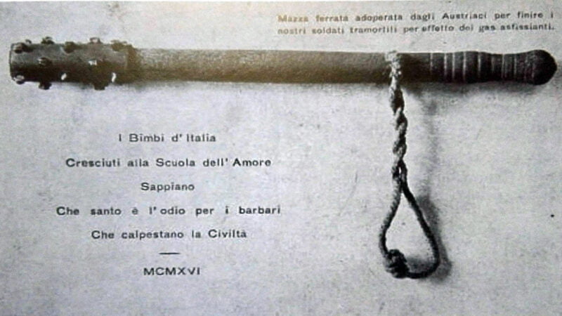 “Mi ha risvegliato questi ricordi una cartolina che ho trovato nel bel volume, curato da Antonio Piotto per conto del Comune di Castello di Godego, sulla storia dell’800 e del ‘900. La cartolina raffigura una “mazza ferrata adoperata dagli austriaci per finire i nostri soldati tramortiti per effetto dei gas asfissianti” dice Cunial.