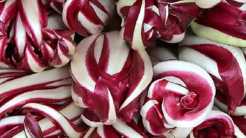 Protagonista in cucina anche il radicchio, bellissimo “fiore” spesso rosso, di casa soprattutto in Veneto. Celebre infatti il rosso di Treviso dalla forma allungata, con foglie strette e cespo semi-chiuso; il rosso di Chioggia, dalla forma sferica e cespo chiuso; il rosso di Verona dalla forma allungata, con foglie larghe e cespo chiuso, e il variegato di Castelfranco dalle sembianze di una delicata rosa.